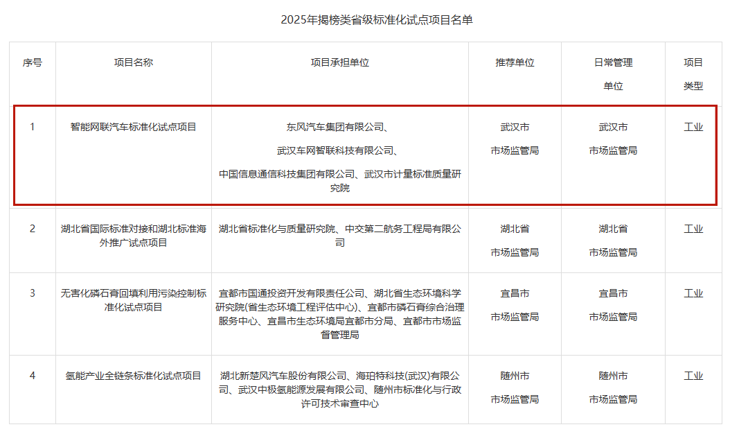 据了解,本次省级标准化试点项目首次增设揭榜挂帅类,重点聚焦先进制造业产业集群,涵盖智能网联汽车、氢能产业等4个领域。其中,智能网联汽车标准化试点项目由东风汽车集团有限公司牵头,中国信息通信科技集团有限公司、武汉市计量标准质量研究院与武汉车网智联共同承担。