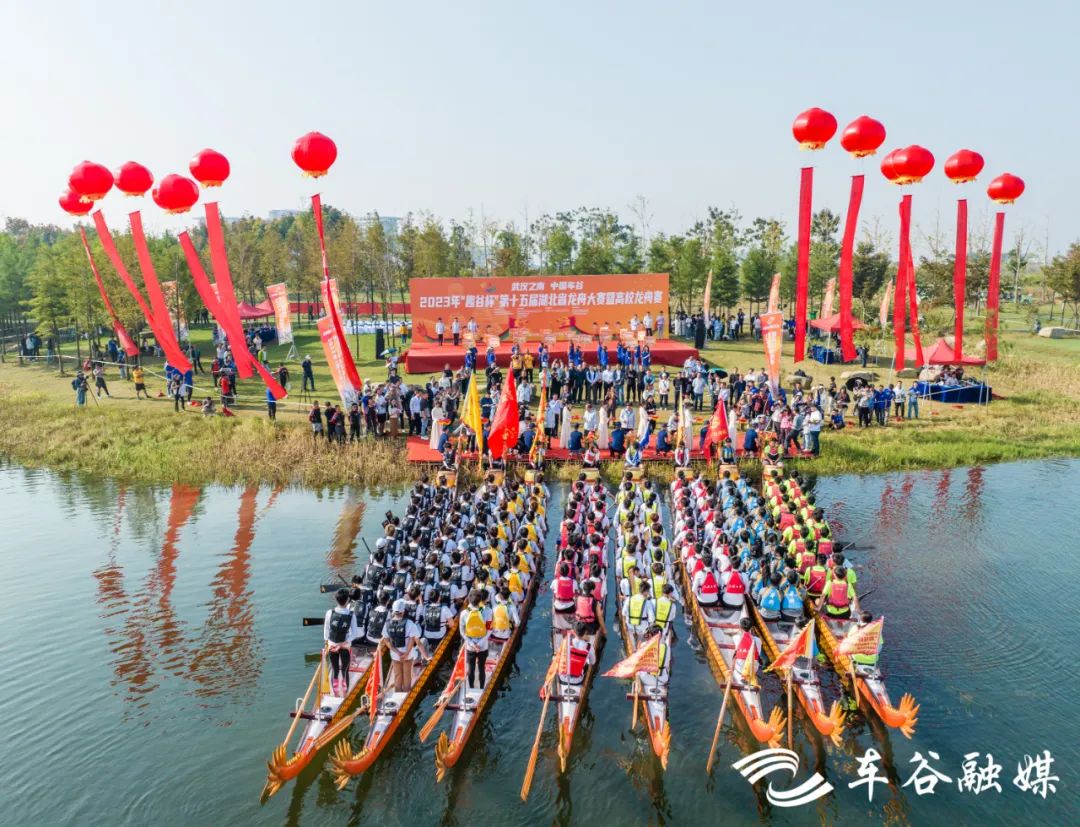 10月15日上午,2023“趣谷杯”第十五届湖北省龙舟大赛暨高校龙舟赛在武汉经开区军山新城举行。来自华中科技大学、江汉大学、武汉商学院等高校的12支大学生龙舟代表队和来自武汉经开区、新洲、仙桃、秭归等地的12支成人龙舟代表队,共同在武汉经开区奏响了一曲奋楫争先的“水上交响乐”。