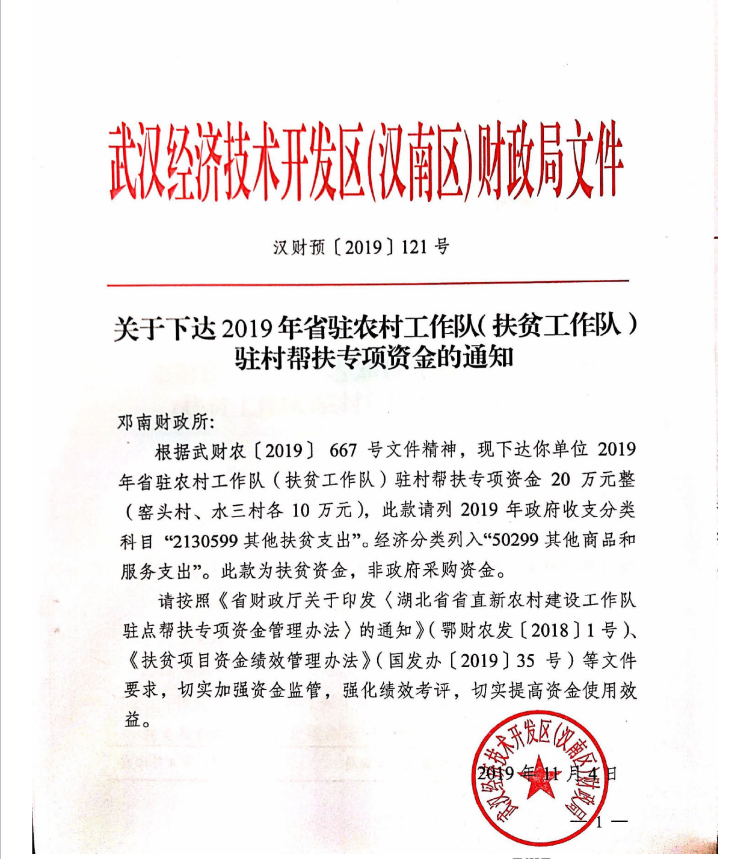 汉财预[2019]121号关于下达2019年省驻农村工作队(扶贫工作)驻村帮扶专项资金的通知