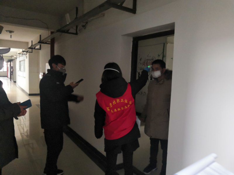 “您好,我们是全力北职工社区巾帼志愿者,我们要给您测量体温”。