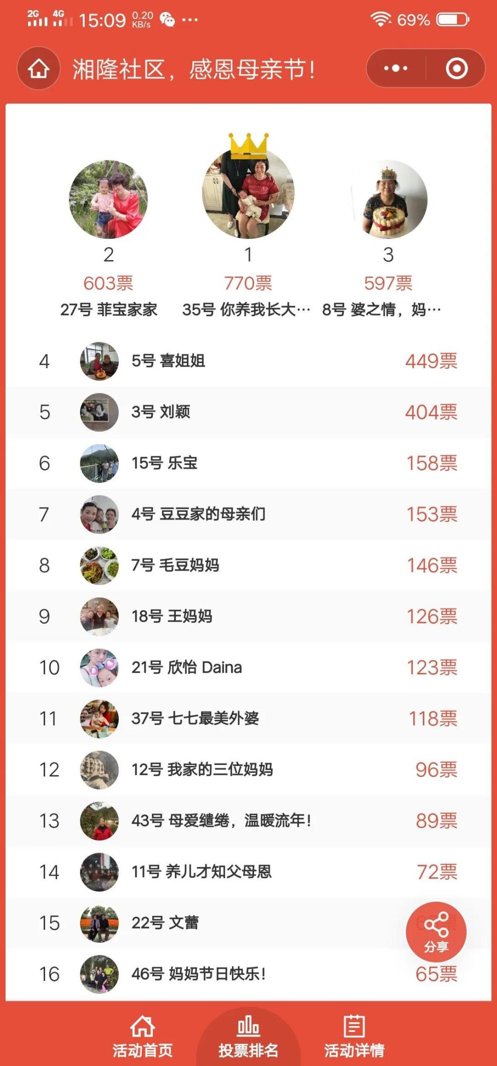 截止2020年5月8日,活动圆满结束,活动线上浏览次数达8848次,获得票数4587票,报名人数为50人,并为所有参加此次活动的居民、志愿者们颁发小礼品,并合影留念。
