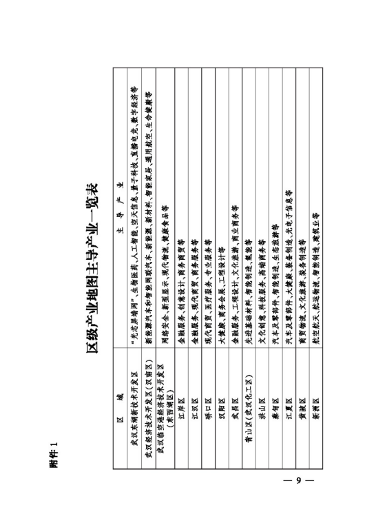 按照“主城做优、四副做强、城乡一体、融合发展”的总体思路,体现各区产业结构特征,提升产业集中度和显示度,突出差异化发展。其中,武汉东湖新技术开发区聚焦“光芯屏端网”、生物医药、人工智能、空天信息、量子科技、直播电竞、数字经济等主导产业;武汉经济技术开发区(汉南区)聚焦新能源汽车和智能网联汽车、新能源、新材料、智能家居、通用航空、生命健康等主导产业;武汉临空港经济技术开发区(东西湖区)聚焦网络安全、新型显示、现代物流、健康食品等主导产业;中心城区(不含青山区)聚焦金融服务、创意设计、商务商贸、文化旅游、健康服务、工程设计等主导产业;青山区(武汉化工区)聚焦先进基础材料、智能制造、氢能等主导产业;蔡甸区聚焦汽车及零部件、智能制造、生态旅游等主导产业;江夏区聚焦汽车及零部件、大健康、装备制造、光电子信息等主导产业;黄陂区聚焦商贸物流、文化旅游、装备制造等主导产业;新洲区聚焦航空航天、航运物流、智能制造、建筑业等主导产业。对照全市产业地图,制定区级产业地图(见附件1),各区明确推动本区主导产业发展的“一谱一策三清单”,即:制定产业发展图谱,出台促进产业发展政策,梳理形成重点企业、重点项目、重点平台3张清单。(责任单位:各区人民政府〈含开发区管委会,下同〉)
