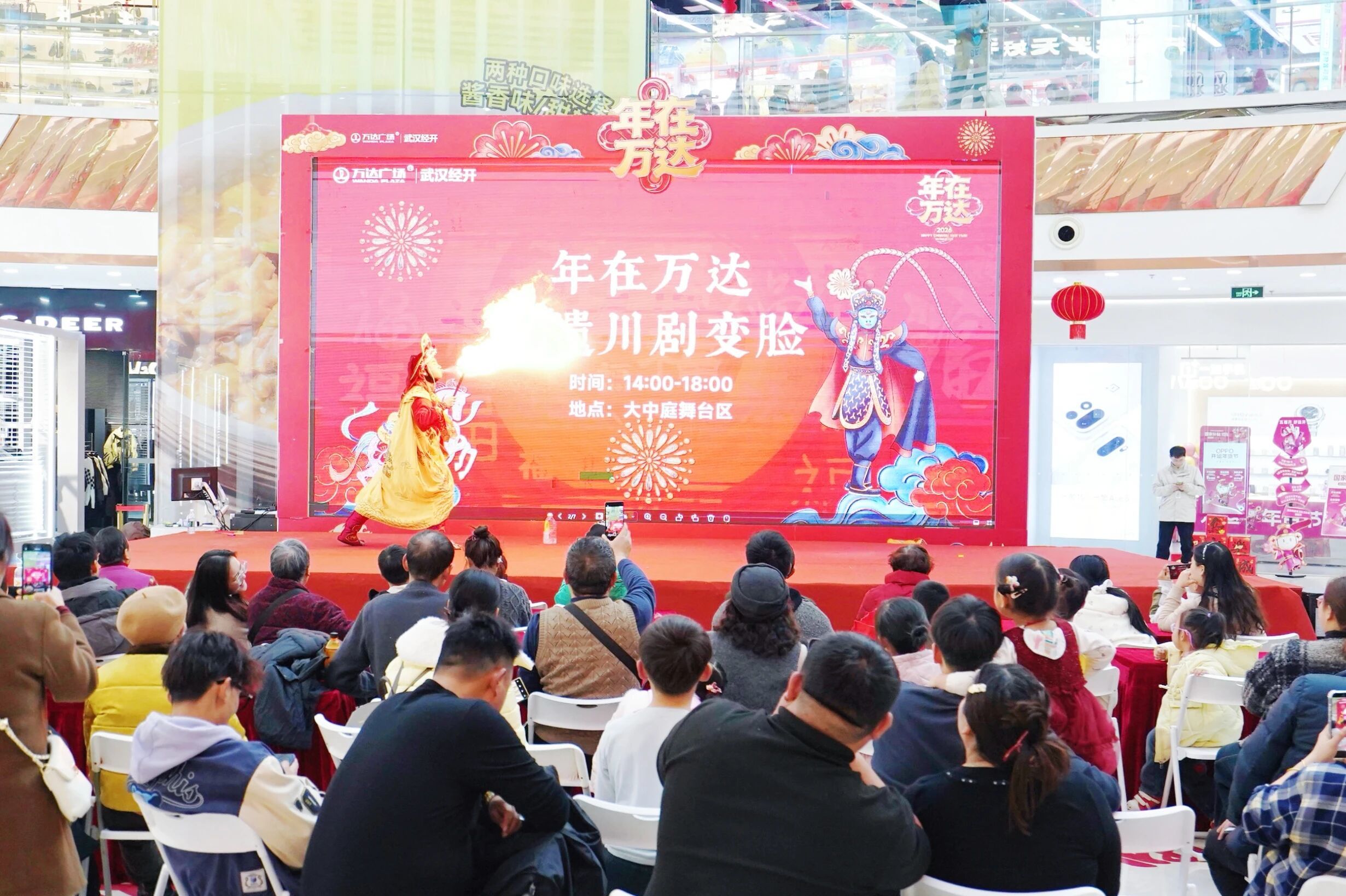 武汉经开万达广场的集装箱集市上,市民喂鸽子、买特色小吃、带着萌娃逛赛尔之城,其乐融融;金街上,小贩都已出摊,阵阵香气飘来,引得不少市民前往购买;中庭广场上,非遗川剧变脸刚刚演罢,就有工作人员招呼市民前来参与制作转花灯笼。