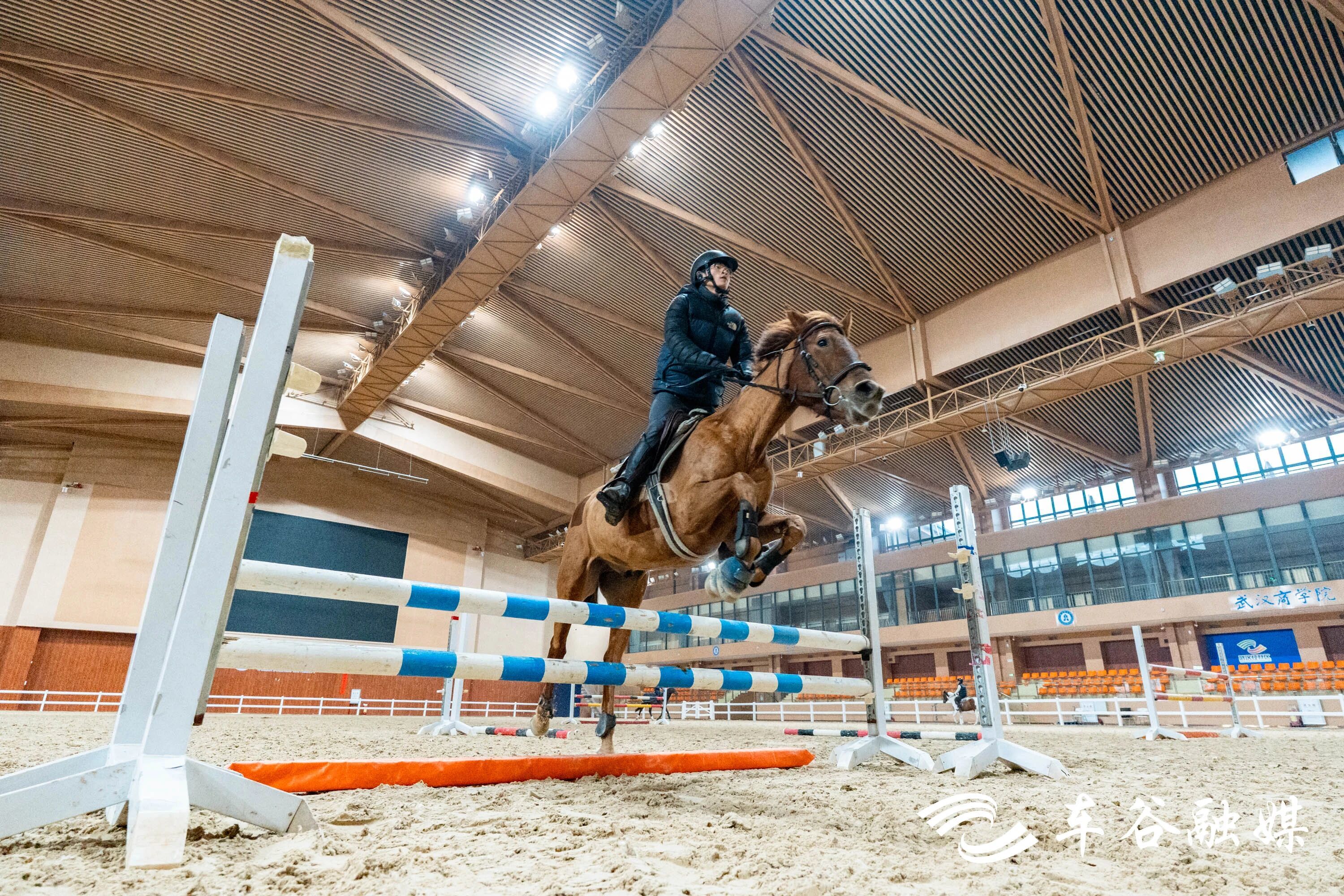 在武汉商学院国际马术学院,每年都有学生报名留校陪马过年,这意味着有更多时间接触和了解马匹、练习马术。训练日常重复而严谨,备马、热身、跳杆、冲洗降温,每匹马训练约45分钟,每人每天可以训练2到3匹,直到晚上十点,他们为马绑好夜护腿、检查完状态,一天才算结束。