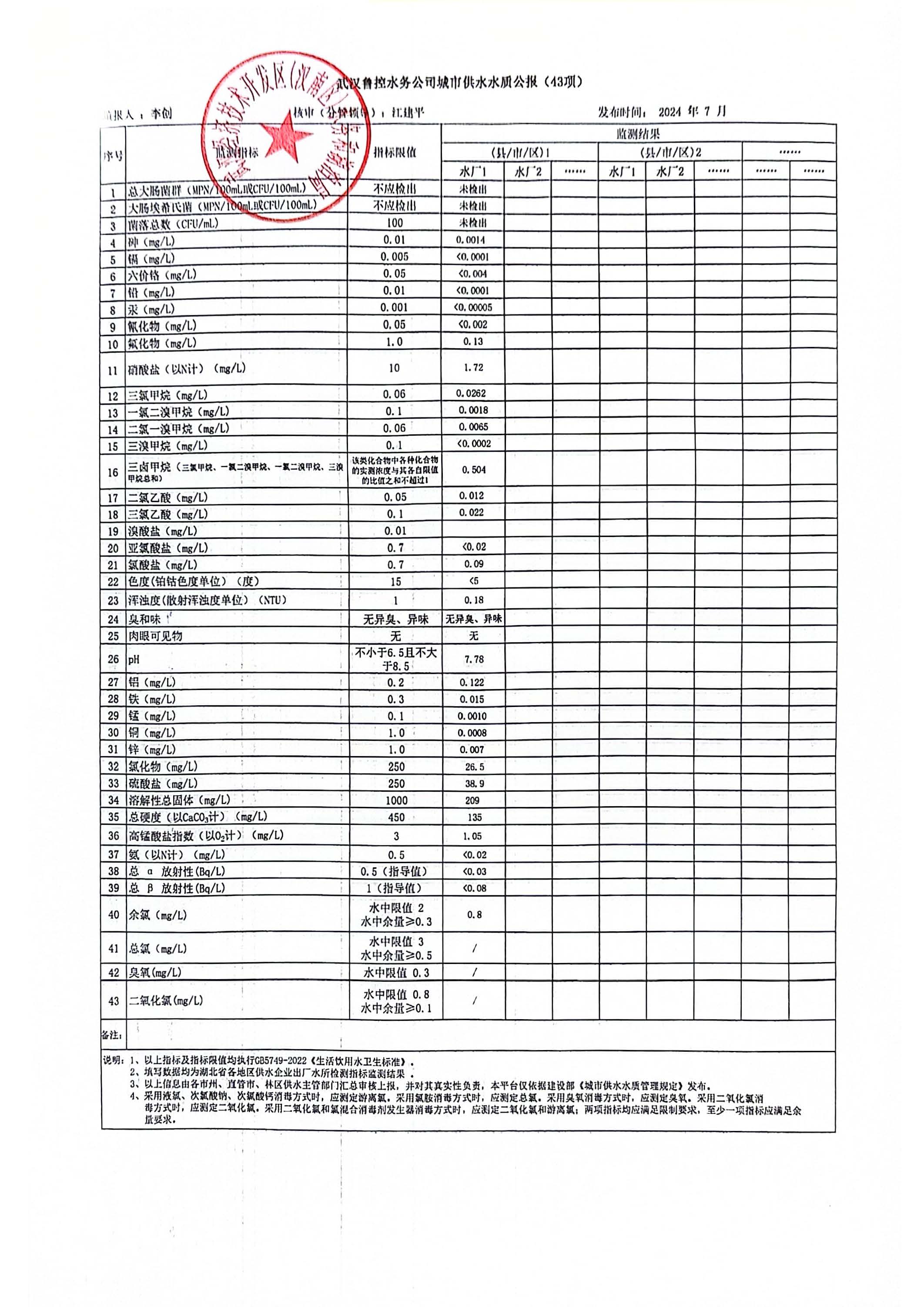 武汉经济技术开发区(汉南区)2024年7月城市供水水质公报